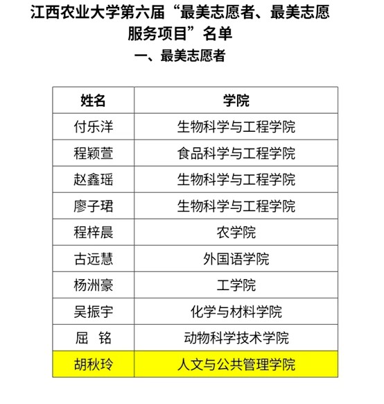 近日,由共青团江西农业大学委员会主办的第六届“最美志愿者、最美志愿服务项目”评选活动顺利结束。我院公共事业管理2301班胡秋玲同学荣获“最美志愿者”称号,学院团委申报的“一村一法律顾问暨农村法律明白人培养工程”项目成功获评“最美志愿服务项目”荣誉称号。